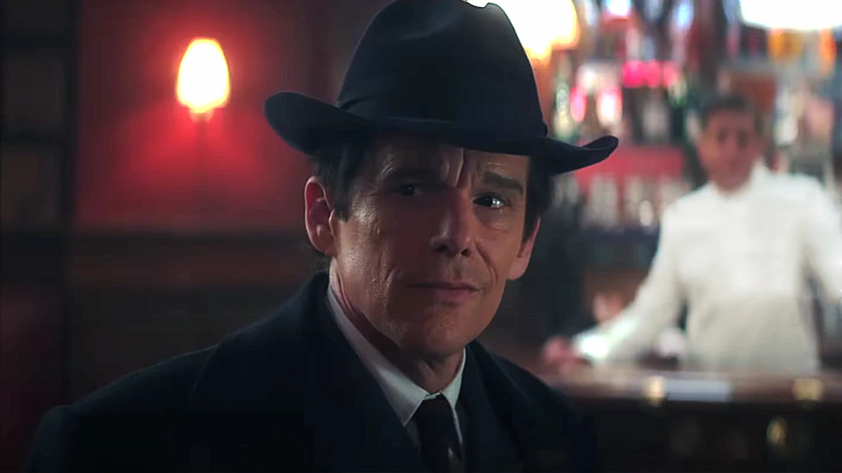 Vaya por delante de todo. Blue Moon es una de las más tristes y más bellas películas del año. Y, para mí, no es sólo superior a la otra obra que Richard Linklater presenta en 2025, Nouvelle vague, sino que se sitúa en las antípodas estéticas de aquella. La historia de la creación de Al final de la escapada (A bout de souffle, Jean-Luc Godard, 1960) se desarrolla en un montaje ágil, en numerosos exteriores y con un tono burlón, desarrollando un argumeto lleno de anécdotas cinéfilas que, aun criticándole, elogia a Godard. Es un auténtico “print the legend”, más allá de la verosimilitud o la realidad factual de sus pasajes. Frente a ella, Blue Moon deviene el honesto retrato elegíaco de un creador insobornable. Sea más o menos cierta, se siente mucho más verismo en esta pequeña gran historia que Linklater nos cuenta. Desarrollándola en un espacio cerrado en una hora y cuarenta minutos, en los que Lorenz Hart (Ethan Hawke, soberbio) [1] se desnuda personal y profesionalmente en sus conversaciones/discursos, el autor de Boyhood nos hace sentir que estamos sentados junto a la barra del club Sardis, contemplando el crepúsculo del letrista de Isn’t it romantic y Bewitched, bothered and bewildered.